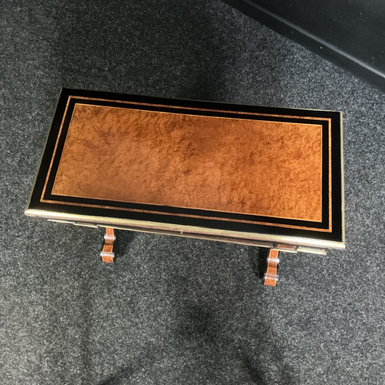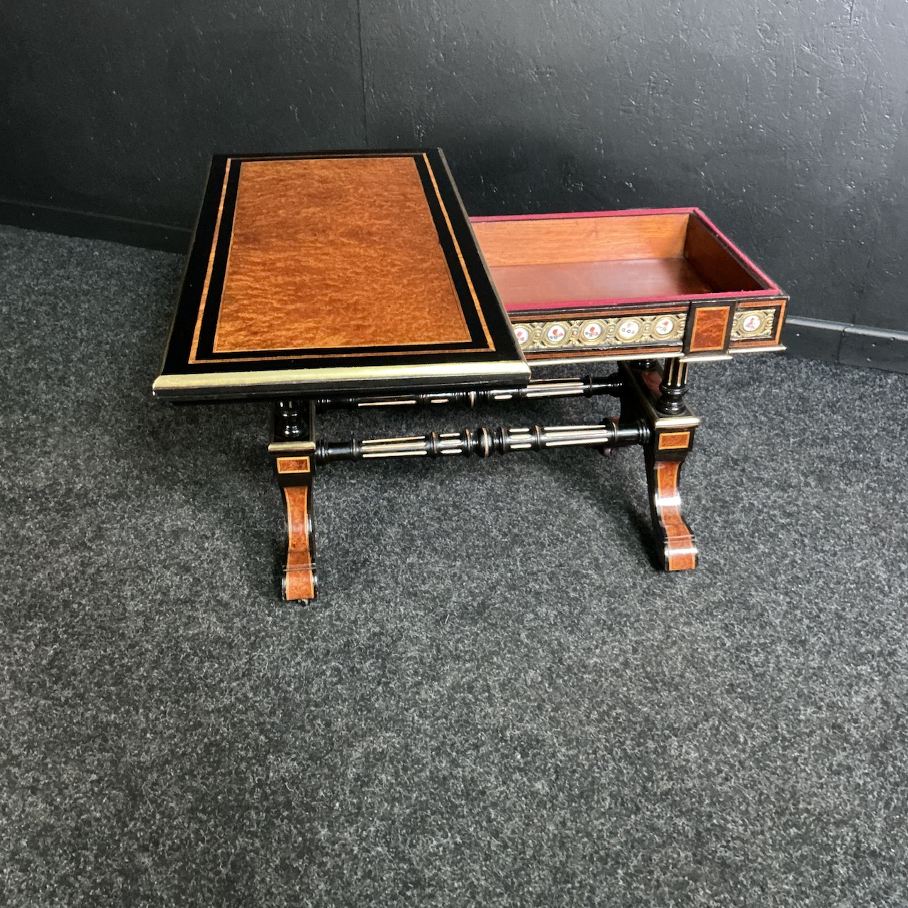 A fine quality coffee/games table from the Aesthetic Movement period, circa 1875. Slightly reduced in height to a more useable and desirable coffee table , better fitting into today’s smaller homes. Typically set onto an ebonized backdrop is mainly rich Amboyna veneers throughout. The top having a rounded brass border, which gives way to an amazing , intricate brass rail that is set all the way round with Sevres style medallions. All sat on gilded columns with a matching pair of stretchers, beneath which are 4 Amboyna inlaid splayed legs. Then you swivel the top and open up the most striking red baize card surface, framed with a tooled leather border , in turn with more cross banding and if not enough, the most delicate Boxwood and green Pearwood stringing. Clearly this table has seen little use and was probably an expensive gift..far too good to use.