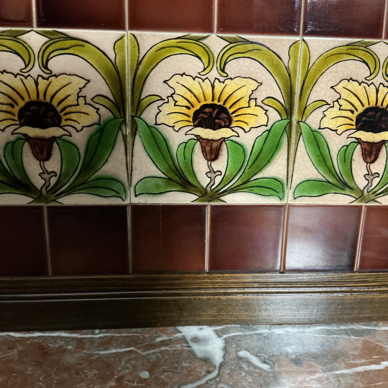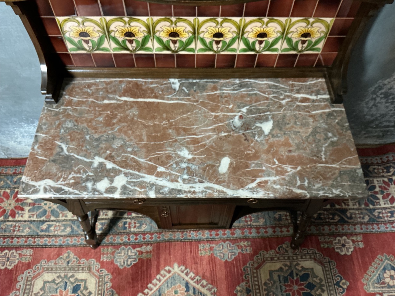 Antique Arts and Crafts washstand by Shapland and Petter. Circa 1890. The highly decorative central tiles have a border of red/brown tiles (of which one has a faint fracture, hardly noticeable). The quality marble top has a super variety of colours and no chips or cracks.The splayed leg base has a single long drawer with a cupboard underneath and still retains all the original handles.This is made from solid Ash of a rich nutty brown colour and is in super condition. SKU-G20