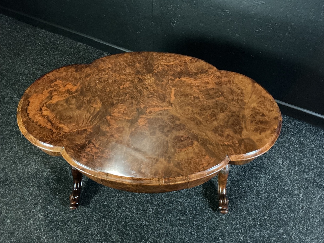 A most stunning mid Victorian coffee table, circa 1865. The double ovoid shaped top has the most wonderful burr Walnut veneers with the added bonus of a pair of blind drawers let into the apron. The base certainly doesn’t let the side down with its turned and carved pedestal supports and stretchers leading down to 4 splayed cabriole legs. The top has recently been re polished and the whole piece presents itself wonderfully.