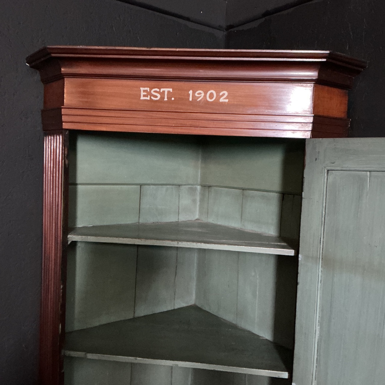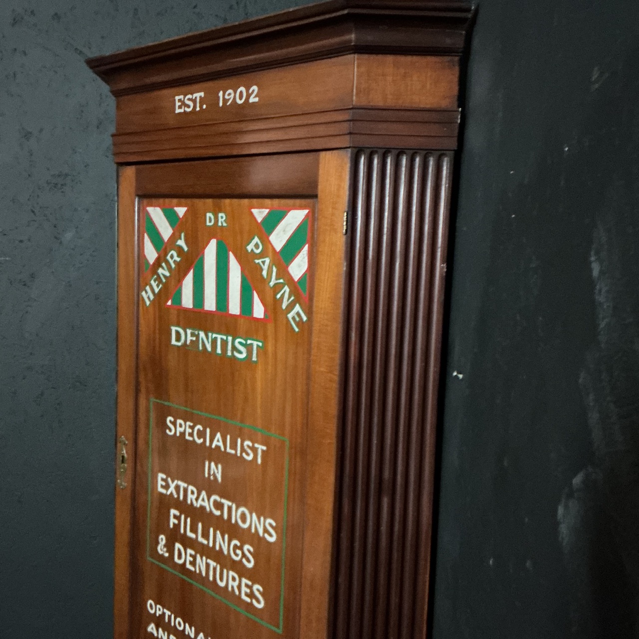 Antique Walnut corner cupboard from the Edwardian period. Circa 1905 Decorated with later sign writing of a dental flavour. The cupboard itself has wonderful deep reeding from top to bottom down both sides and the Walnut is nicely figured. With an ogee cornice and turned feet all adding to its appearance. The shelved interior retains its original paint and gives great storage. A real conversation piece, ready to use. Keys present. SKU-G31