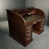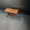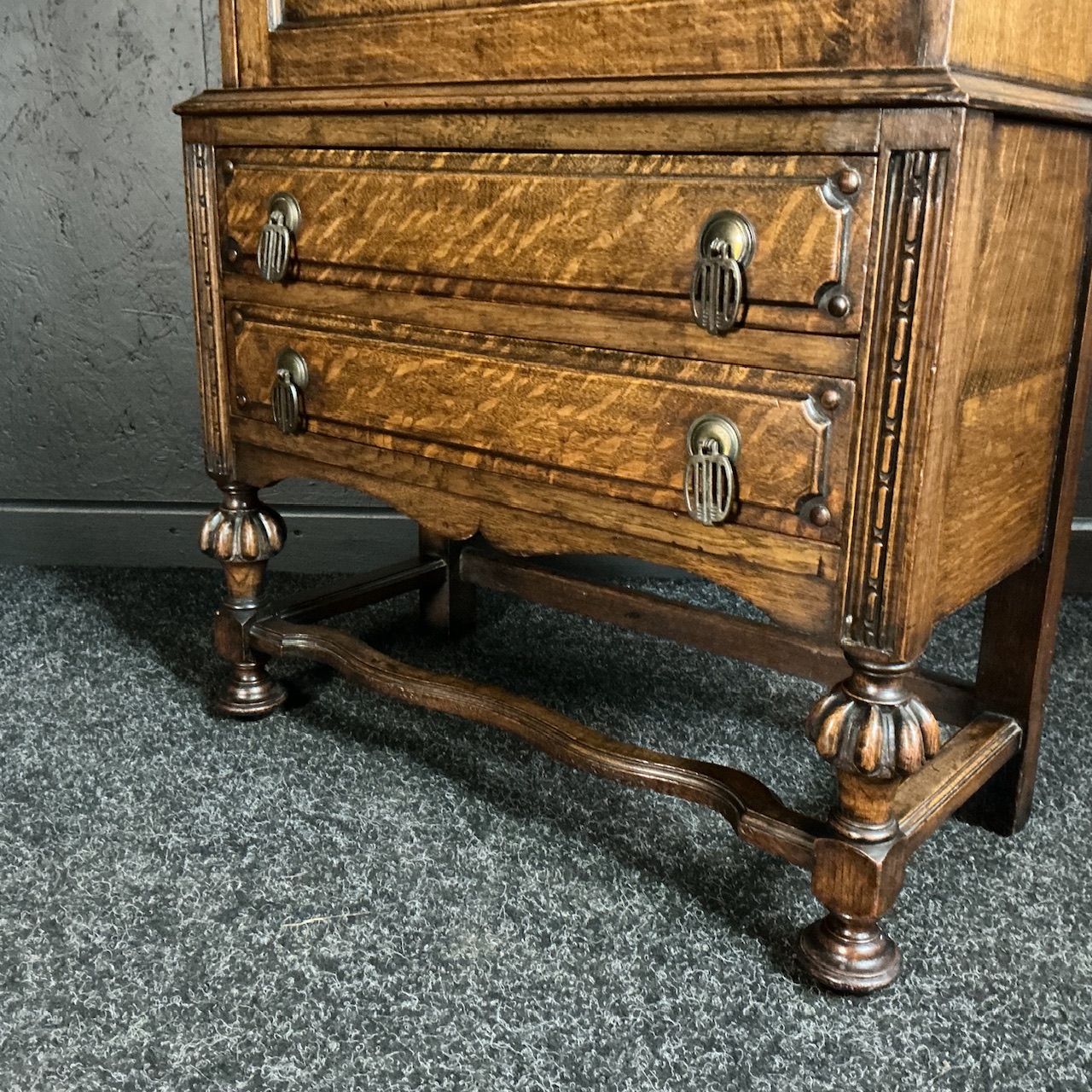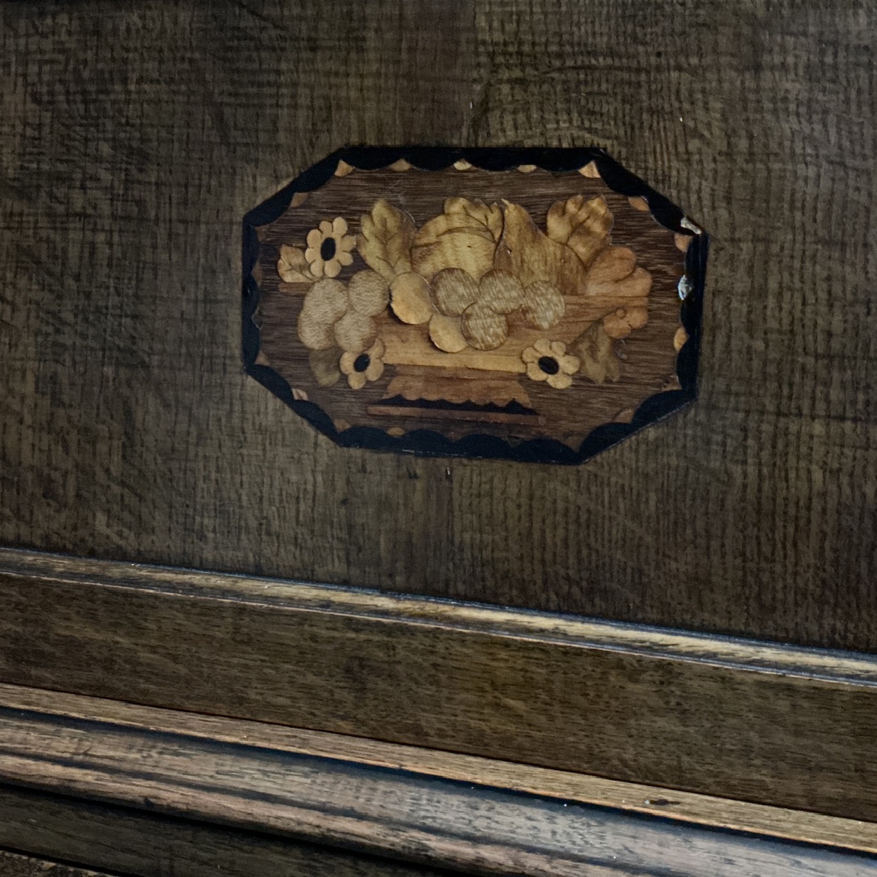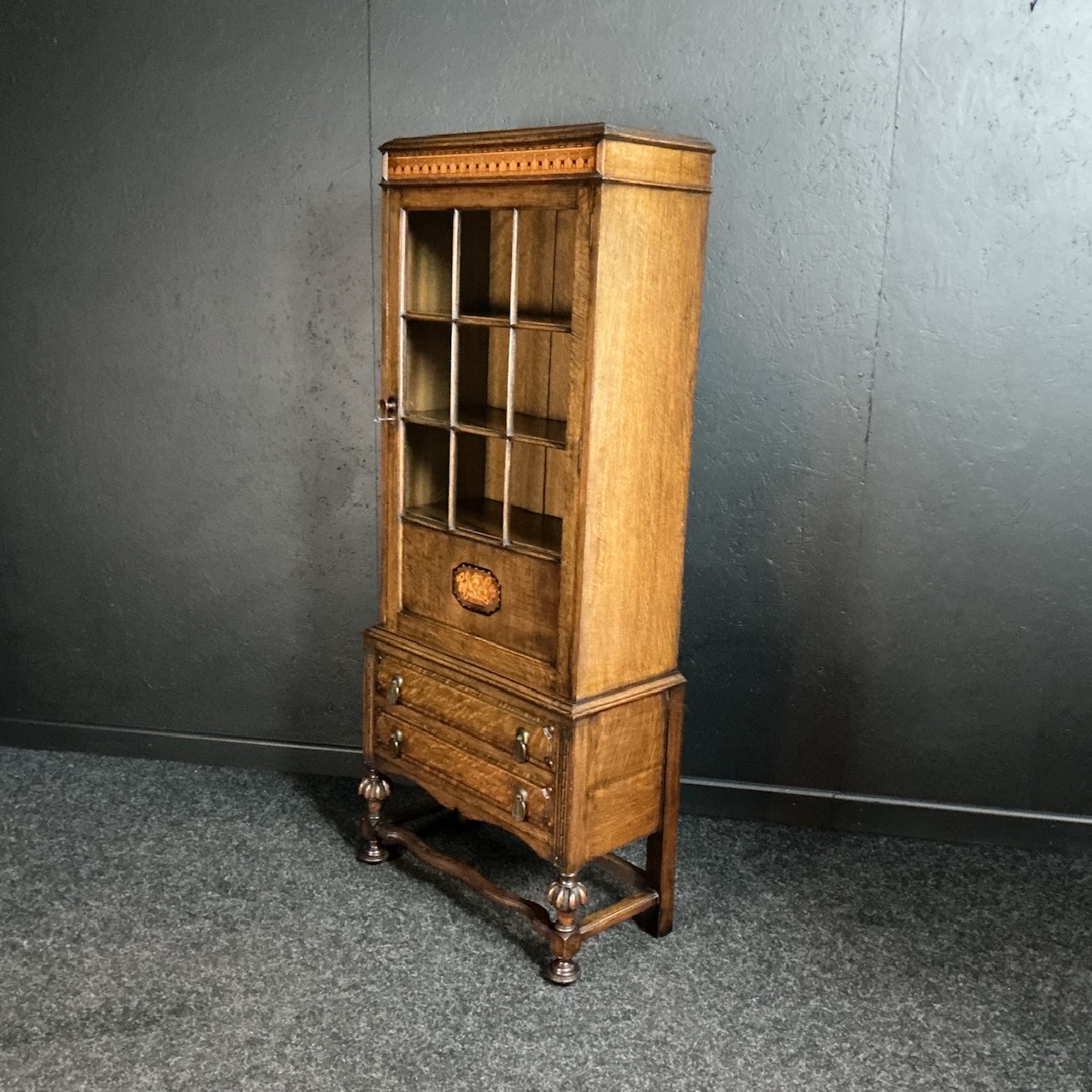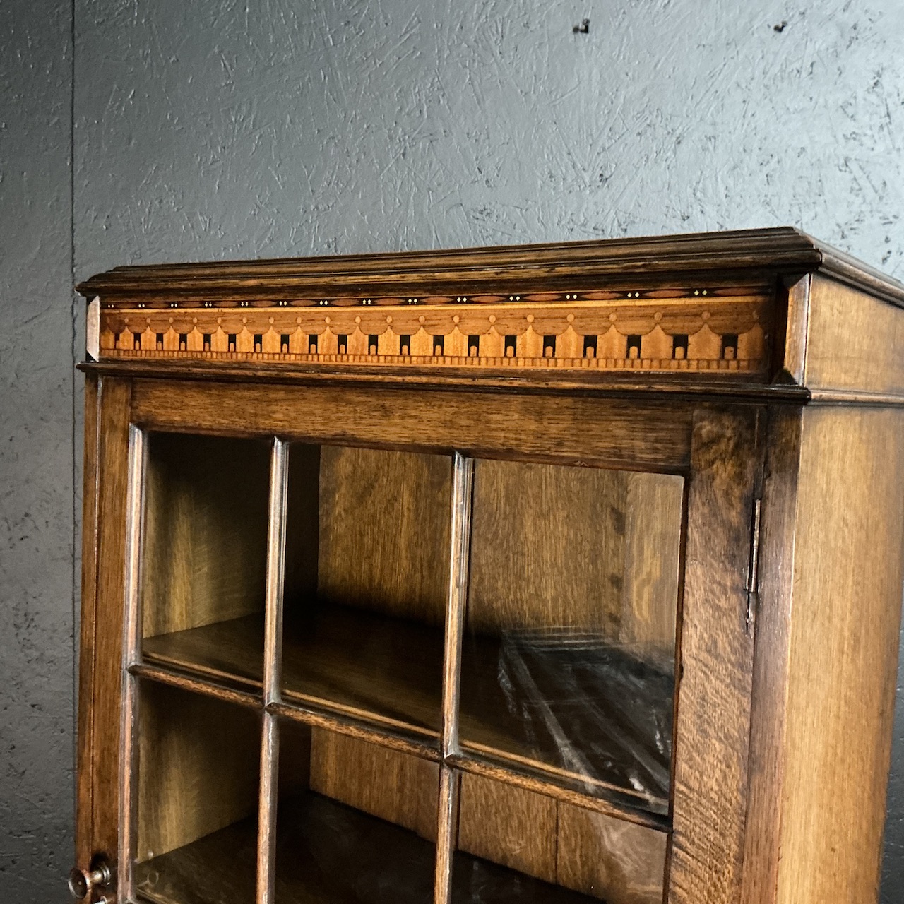An unusually small solid Oak bookcase of much above average quality. Very rare to get a marquetry panel set into the door, complimented with a parquetry cornice. The handles have a strong pre Art Deco design and the base has nicely turned and fluted legs, set in between shapely stretchers. Even the shelves are solid Oak with a reeded edge to the front. Condition is very good and all ready for the next 100 years. SKU-G130