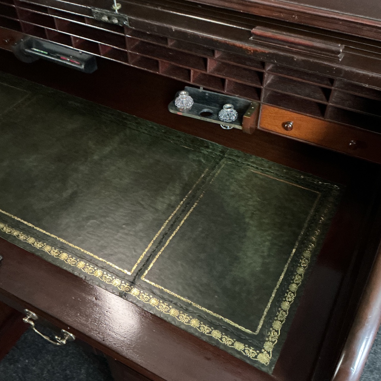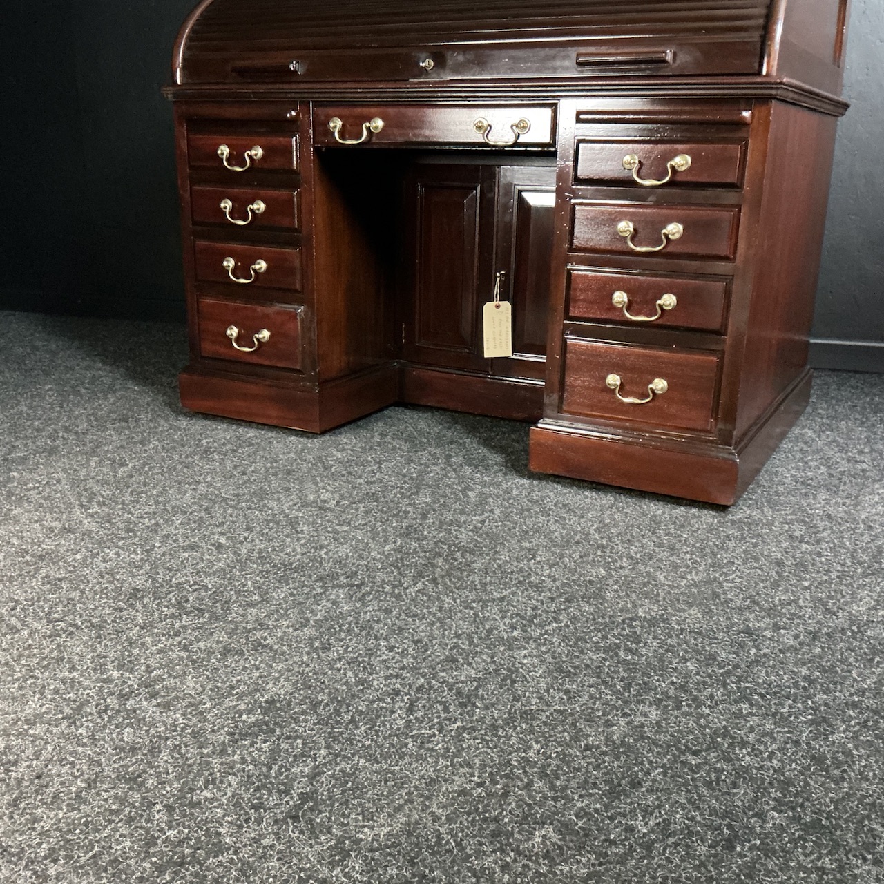 A beautiful solid Mahogany roll top desk, circa 1905. Super quality desk with a fantastic interior of pigeon holes , drawers, new tooled leathers , original swivel ink wells and pen tray. The pedestal drawers lock automatically when the tambour is closed and unlock when opened. Polished to all sides gives you the option of placing the desk off the wall. There is a small cupboard recessed in between the side drawers. Part of our huge selection of fully restored roll top desks. All ready for work. SKU -G129