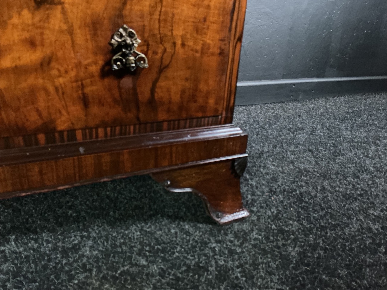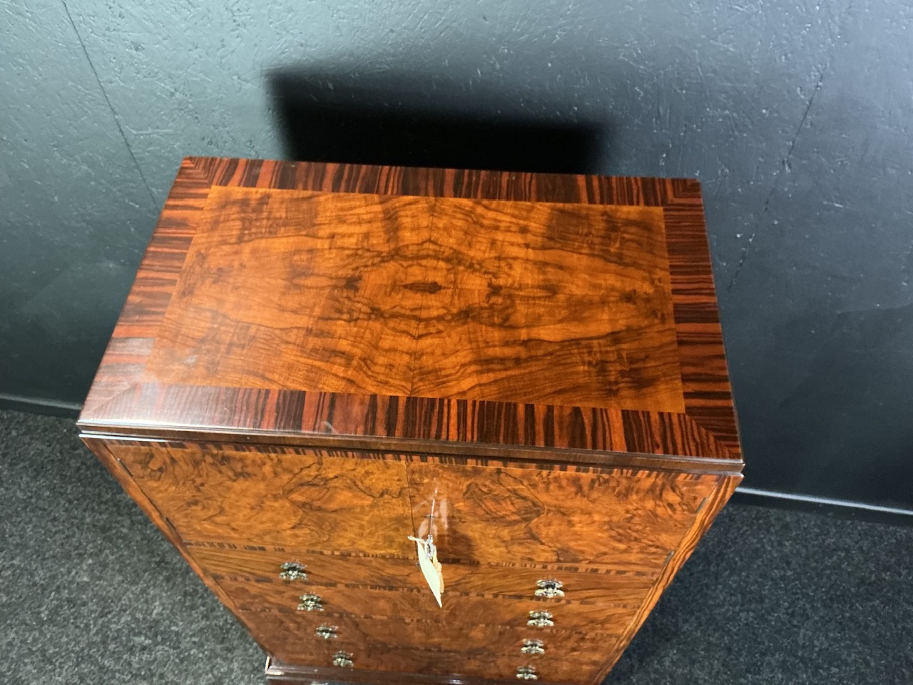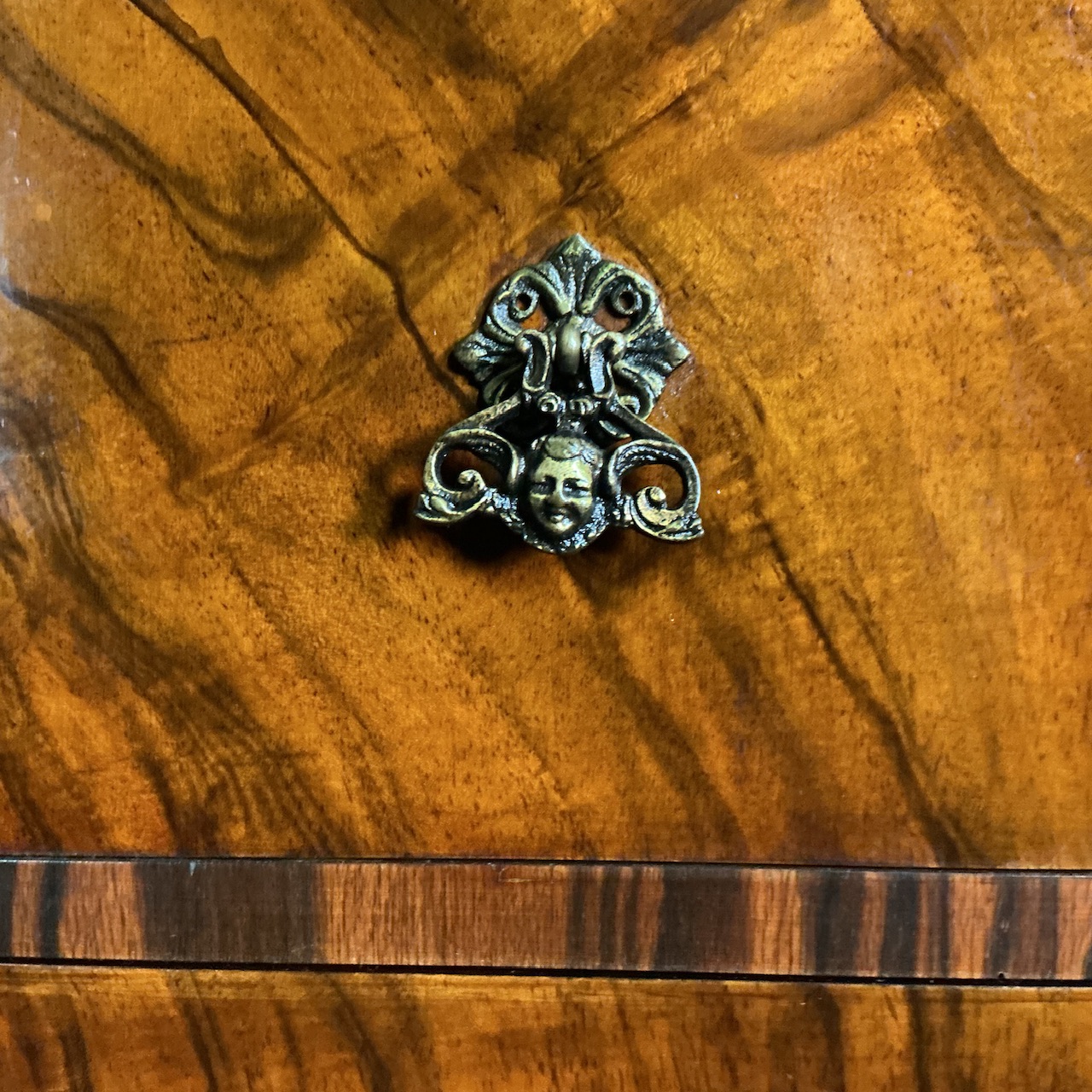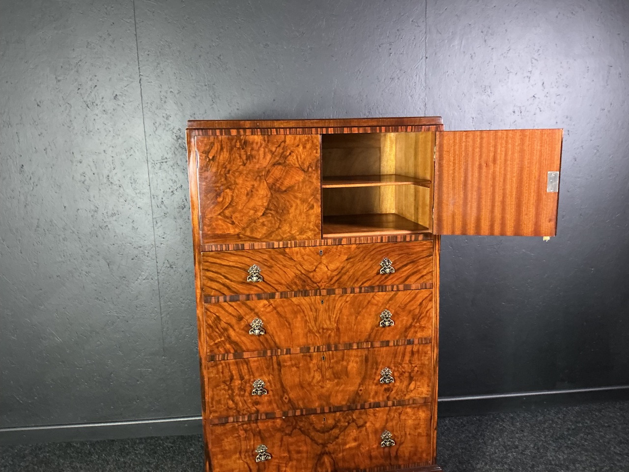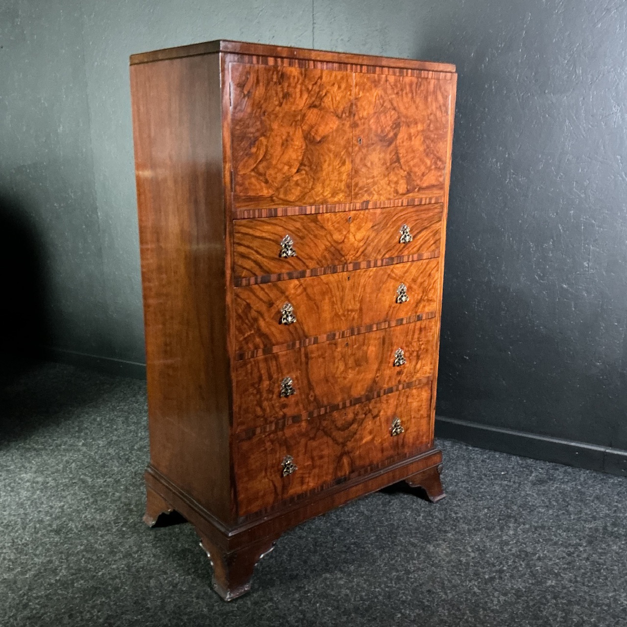A super quality Art Deco tallboy from the 1930s. Beautiful figured Walnut veneers set off with Macassar cross banding throughout. All locks working with keys present. The drawers have wonderful cast brass drop handles set with a central cherub. All sat on splayed ogee bracket feet and very sturdy. Part of full bedroom suite that we are selling individually, but feel free to ask if you wanted to keep it all together. There are minor mark’s here and there but overall nothing serious and generally very good for its 90 years. Free UK mainland delivery to most parts . SKU- G143.