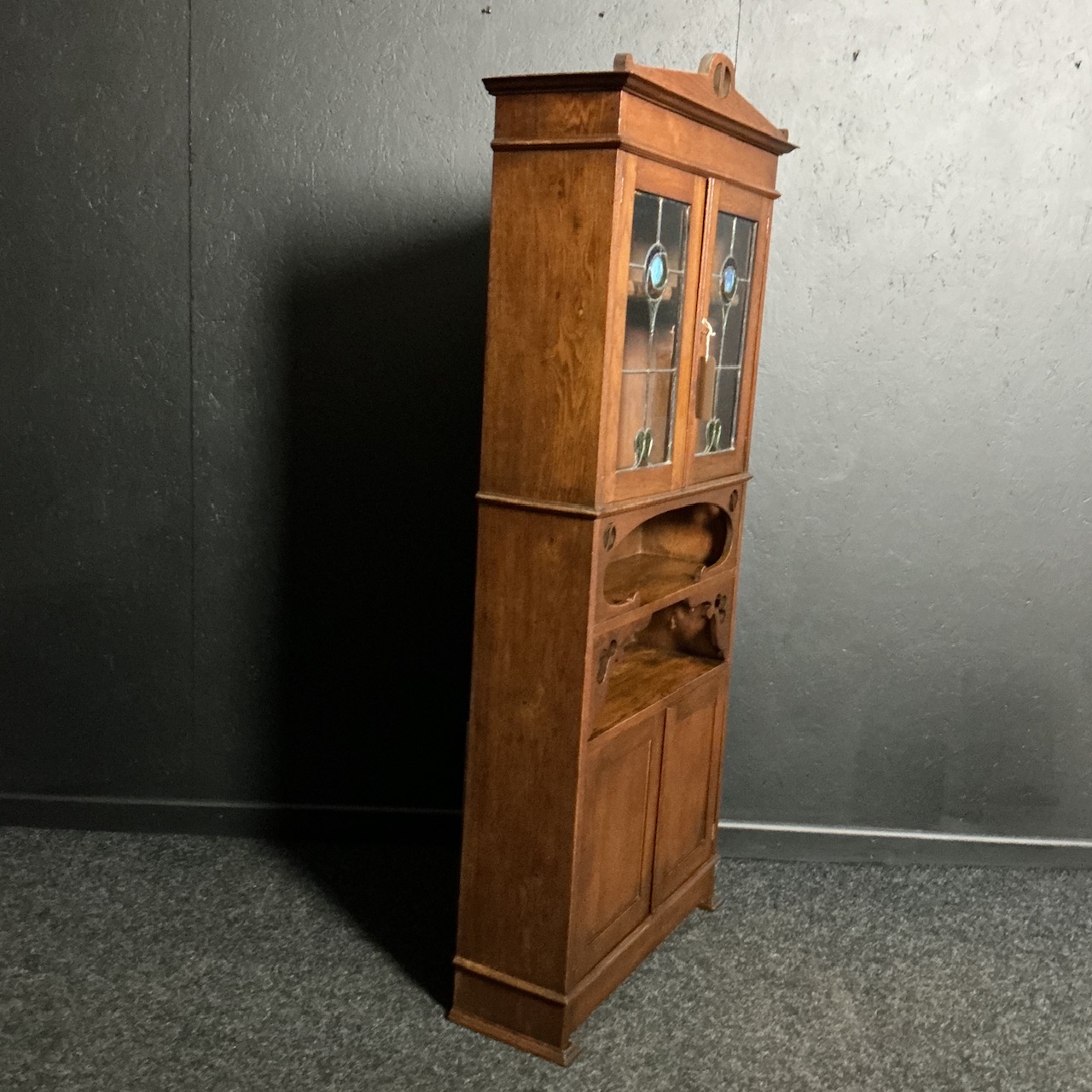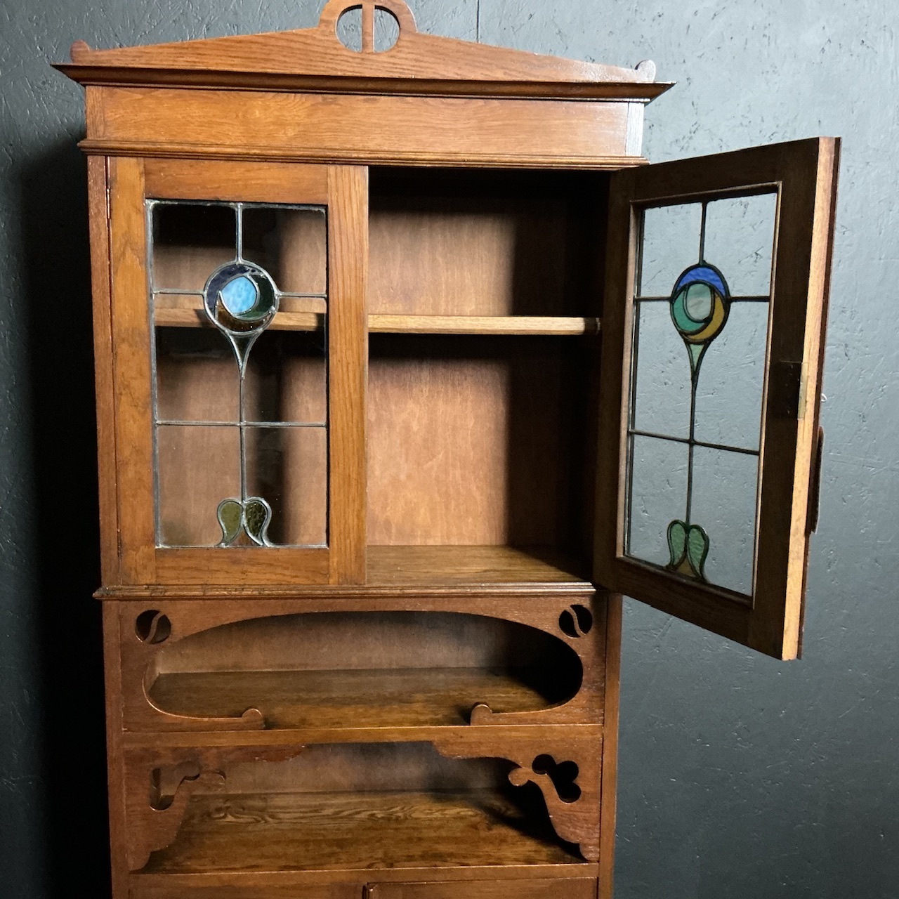 A slender solid Oak bookcase from the Arts and Crafts period, circa 1890. With a 2 door base , 2 recessed central shelves and a very attractive pair of leaded light doors above. Condition is good, ready to use. H.184 cm x W.81 cm x D.28cm.