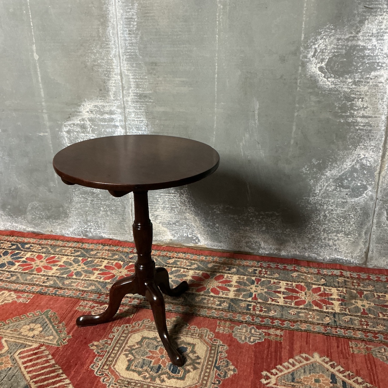 A good Georgian Mahogany tripod/wine table from the late 18th century. The solid Mahogany top has been fixed at some point in its life but is not really detrimental, many could prefer its extra firmness . The crisply turned centre pedestal sits above a trio of undamaged cabriole legs. Only one or two minor marks under the polish but nothing you wouldn’t expect at 240 years old. All ready to use and enjoy. SKU-G27