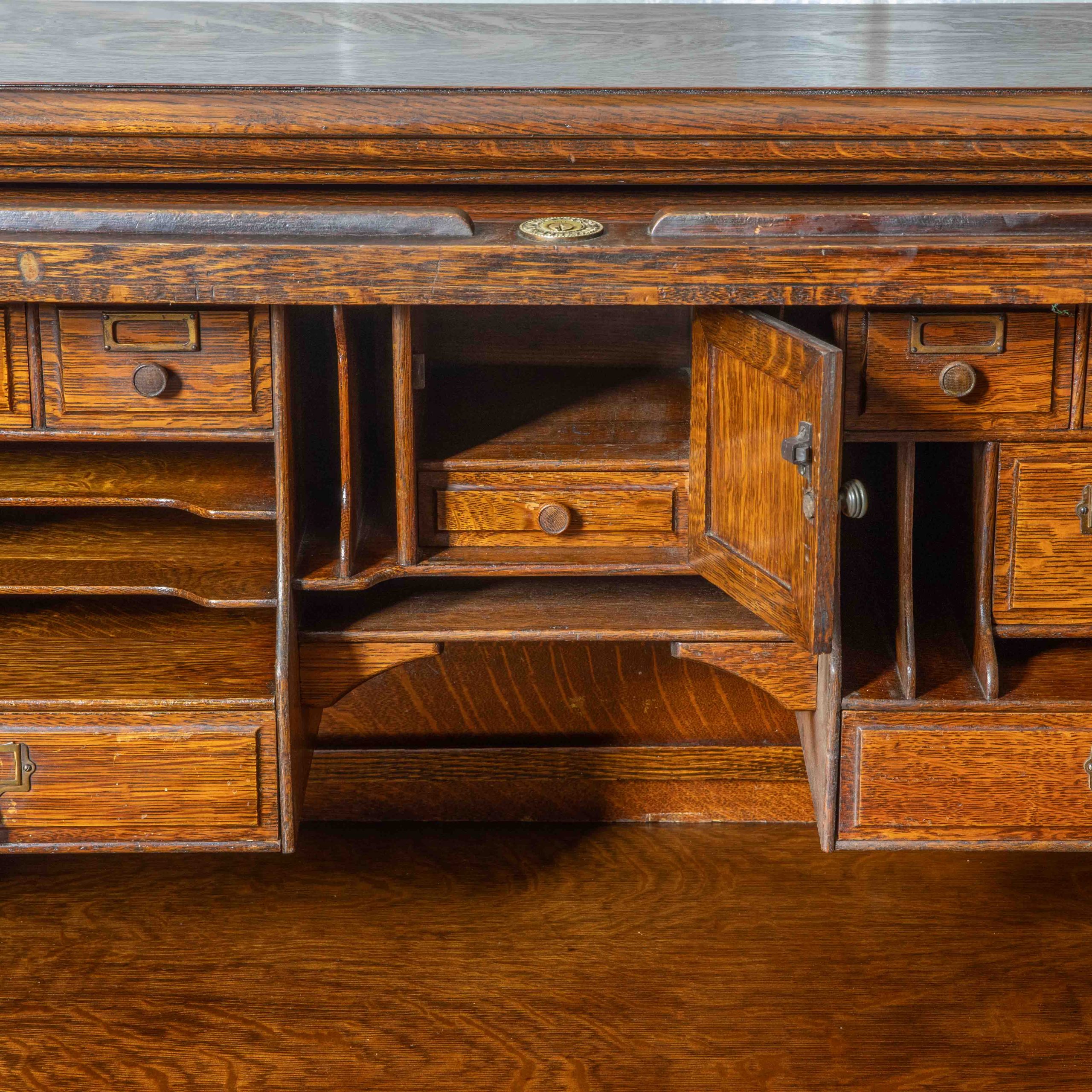 A super quality oak roll top desk from the Edwardian period. The original lock and escutcheon shows that it was made by Maples & Co of London and Paris with later Maples storage labels showing. As with all our fully restored roll tops, a desk to this standard would have belonged to the company boss, doctor, lawyer etc not your junior clerk. Even today most people of taste and substance like to sit at a quality desk. This particular desk has a rather attractive fully fitted interior with an array of drawers and pigeon holes. All the panels are fielded (bevelled) and the drawers have nicely carved handles. All sympathetically restored. Dated on internal drawer bottom with writing “God First” April 21st 06 (1906).