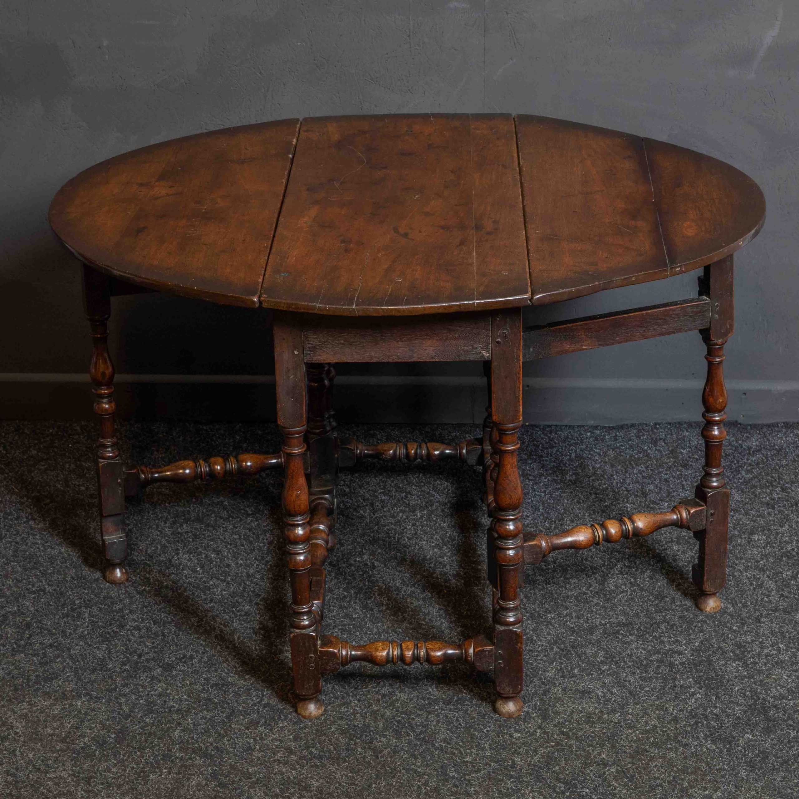 A superb early 18th century red walnut gateleg table of small proportions and with wonderful untouched patina. Probably had a small drawer at some stage but not noticeable. The legs and stretchers are crisply turned and with only a little wear given their 300 years. The walnut is of a rich warm colour and the whole is in very good condition.