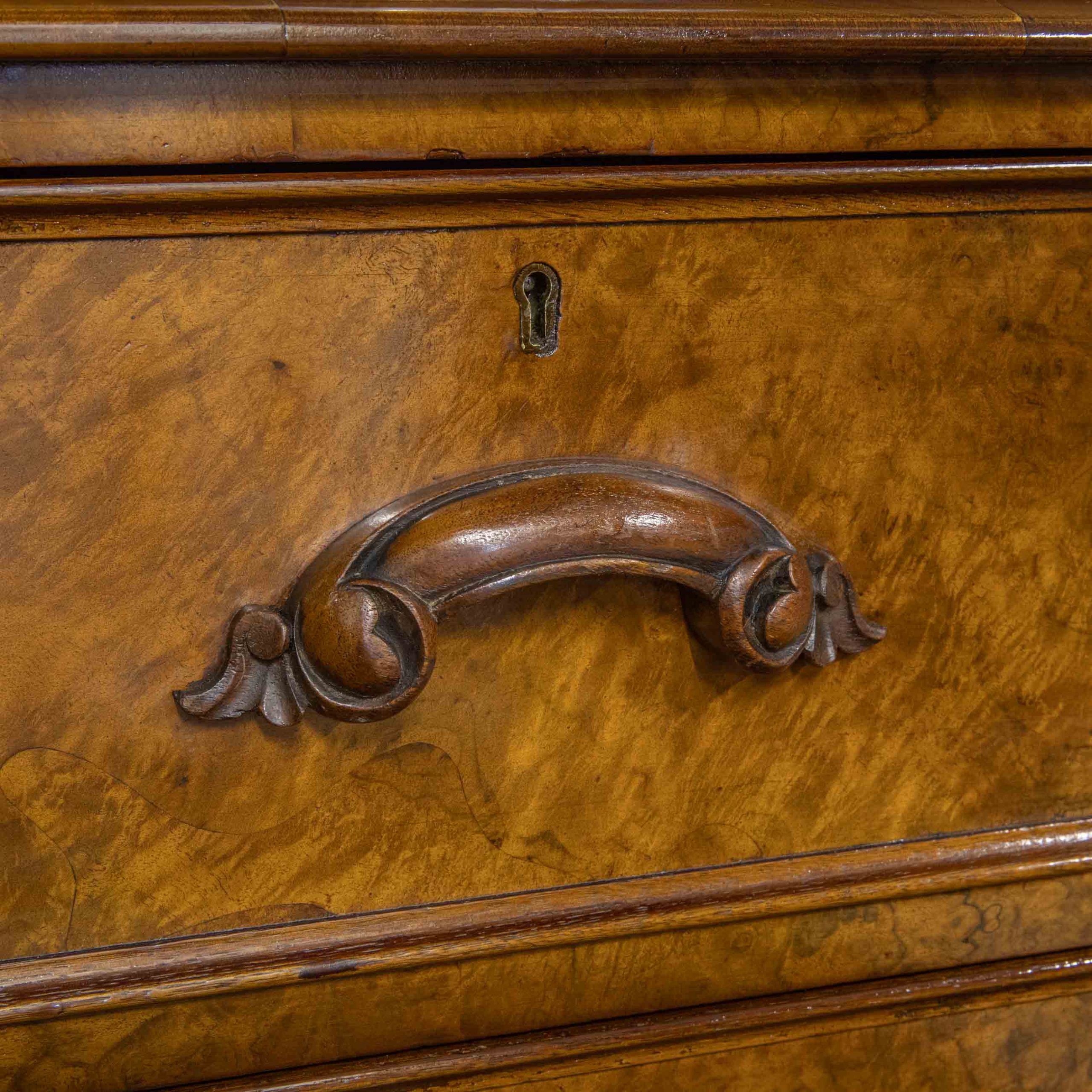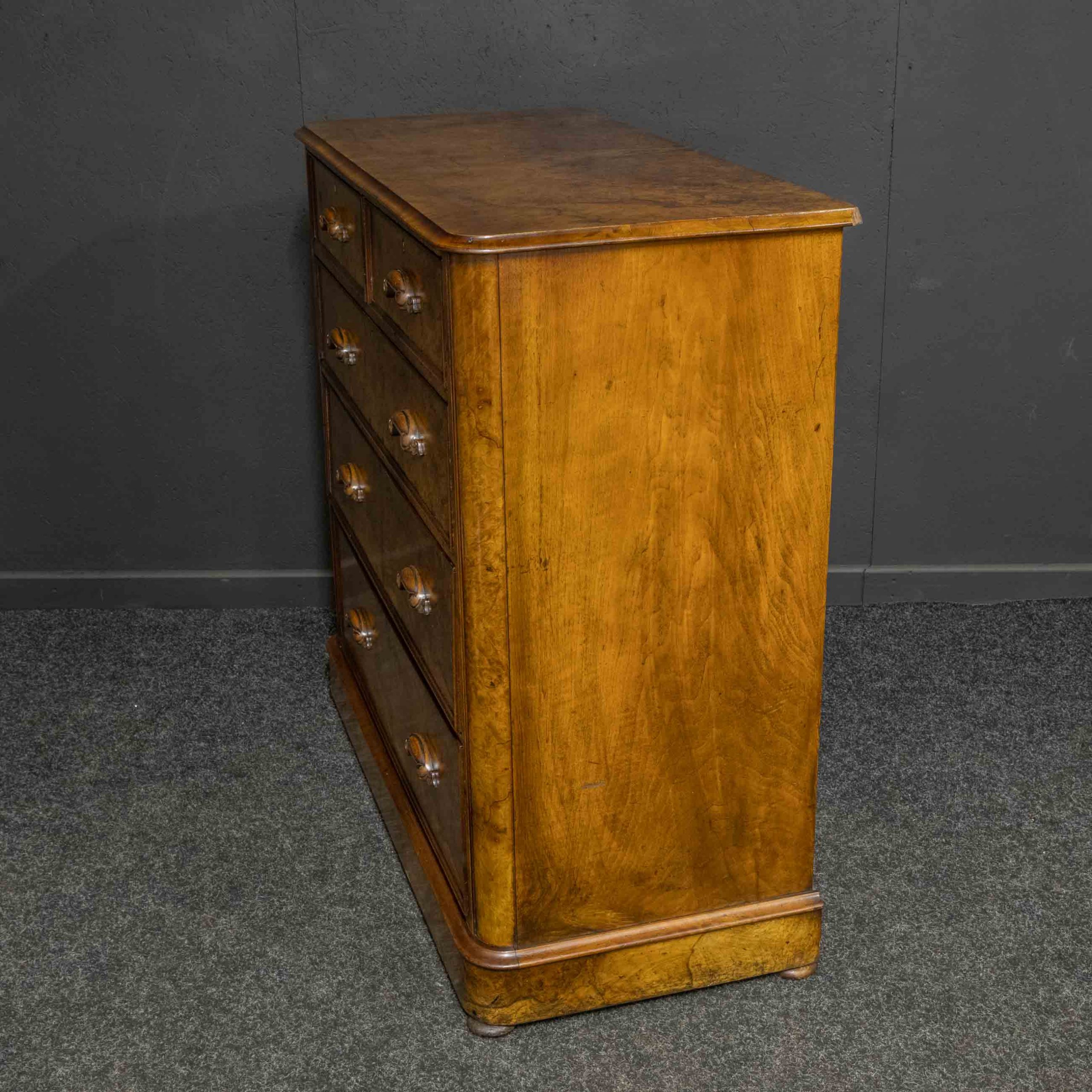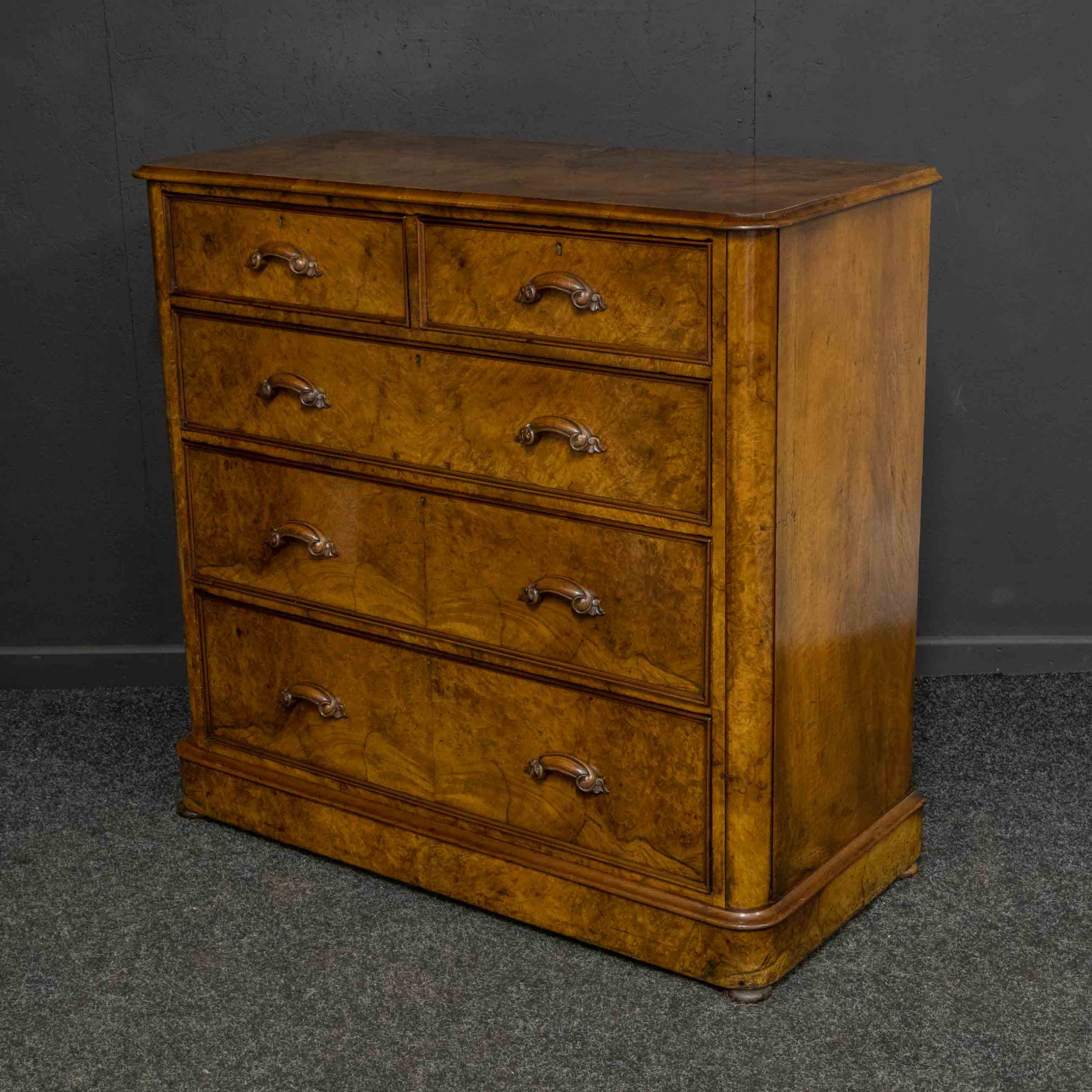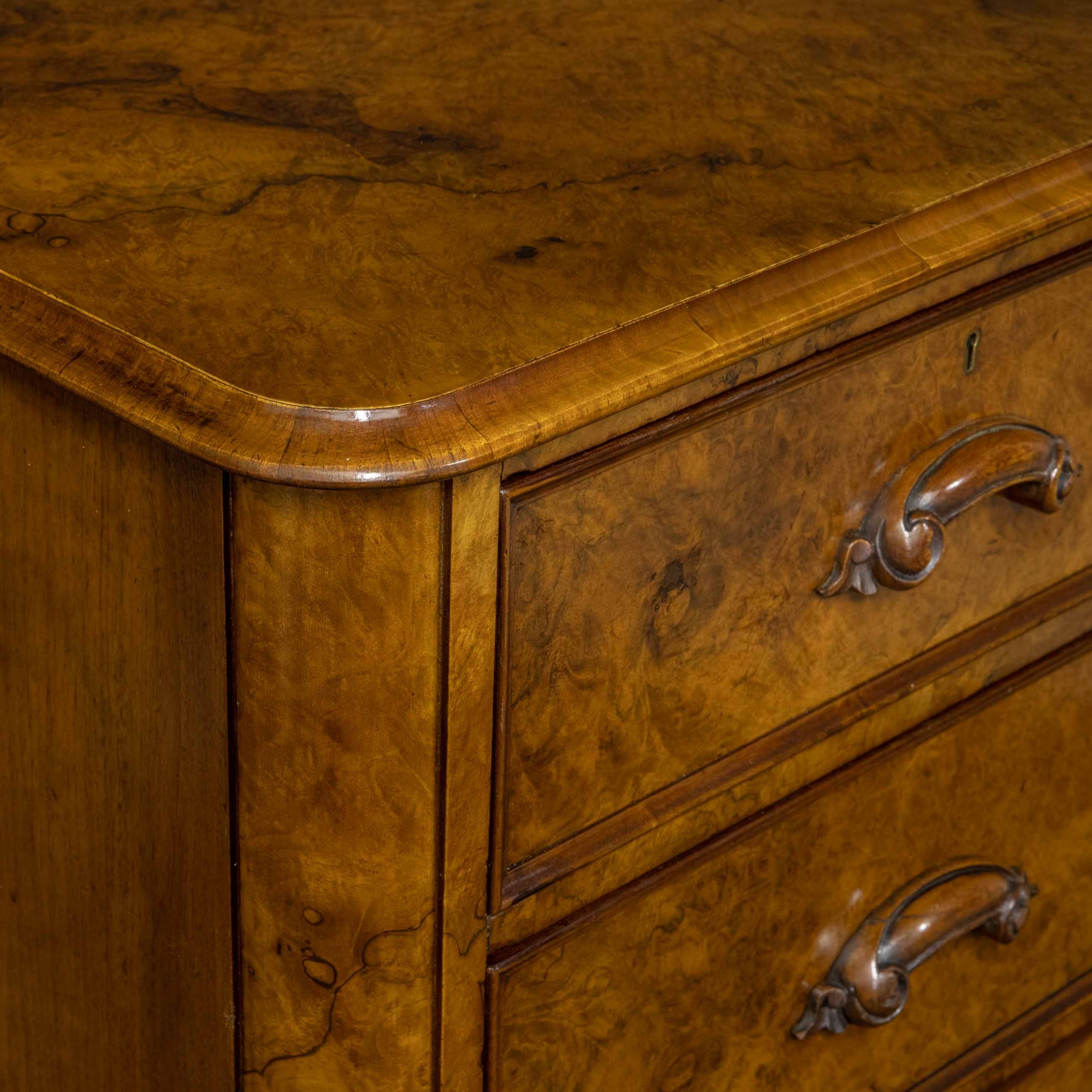 A beautiful Mid Victorian burr walnut veneered chest of drawers. Recently re-polished and with the original carved pull handles.
