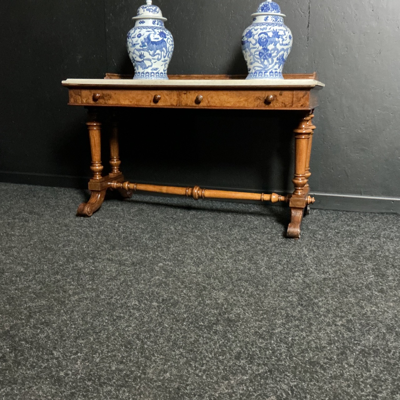 A quality mid Victorian Burr Walnut Side Table.circa 1870. The top is of lovely white marble set with a faux Burr Walnut gallery. Lower down you have a pair of convincing dummy drawers, all of which sits on 4 end pedestals which terminate in a set of long scrolled legs, all finished with a turned stretcher. Many uses around the home or business.. Desk… Bathroom…Hall table…Drinks…All in very good condition and ready to use.