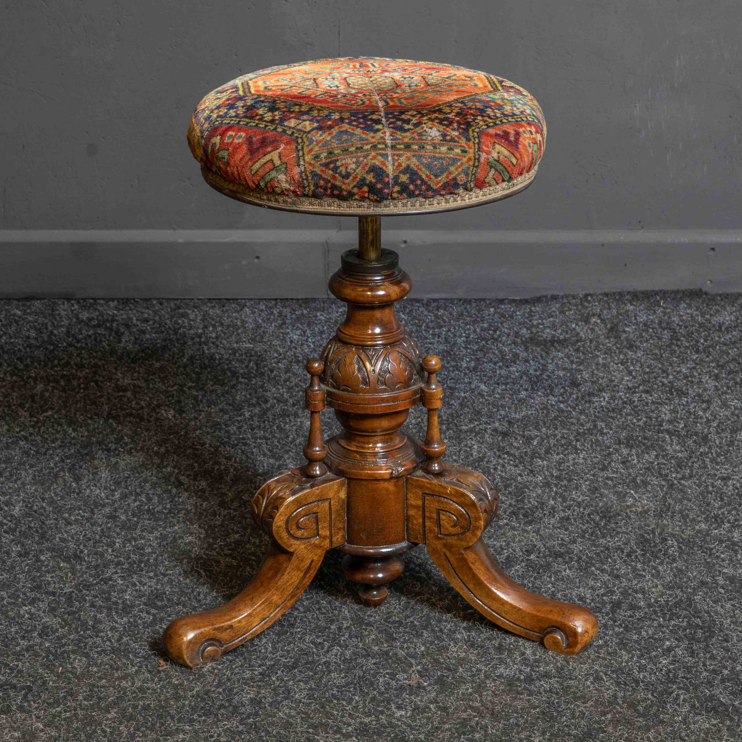 An attractive walnut piano stool from the late Victorian period. The carved and splayed legs give way to a carved and turned pedestal adorned with unusual turned spindles. The top is upholstered with a delightful heavy duty velvet seat, which has the usual swivelled top to give height adjustment. All in lovely condition and ready to use.